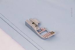 De open naaivoet met geleidelijnen vergemakkelijkt het naaien van covernaden. De grote opening aan de voorkant en de rode lijnen zorgen voor een goed zicht op de naden en helpt u bij nauwkeurig locken. Deze naaivoet heeft een stevig achterstuk, waardoor hij beter over dwarsnaden glijdt.