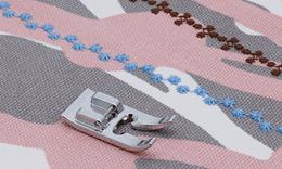 De candlewickingvoet heeft een speciaal gevormde, uitsparing in de onderzijde van het voetje waar de verhoogde bolletjessteken gemakkelijk onder kunnen, om ongewenste druk op uw afgewerkte steken te vermijden. Ook ideaal voor andere verhoogde of driedimensionale steken, en voor naaien met dikker katoengaren.