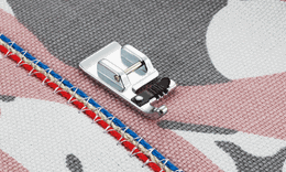 Met deze voet bevestigt u drie of minder koordjes, woldraad of decoratieve draden. Steek de koordjes eenvoudig onder het klemmetje en naai vast met een zigzagsteek of een andere decoratieve steek. Leuk om garendecoraties mee te maken, als ‘couching’!